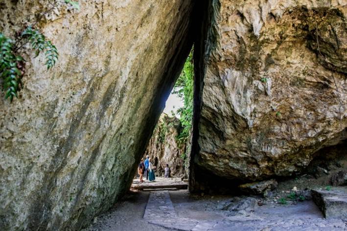 ひっそりとした森のような中にそれはあります。御嶽の中には6つのイビ(神域)があり、琉球国王はこの六カ所を参拝しながら、国家繁栄・安寧、五穀豊穣、航海安全などを神に祈願していたそうです。その中でも特にパワーが強いと言われているのが「三庫理(さんぐーい)」です。御嶽の一番奥にあり、2つの大きな岩が支えあうように立っていて、人が通れるようになっています。その奥に行くと、神の島と言われる「久高島」を眺めることができて、まさに神秘的な雰囲気です。